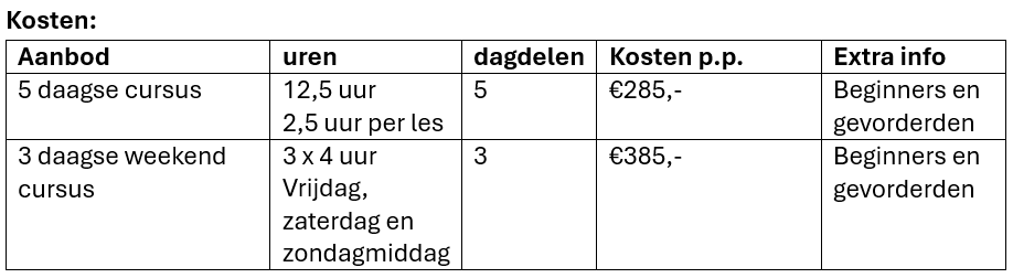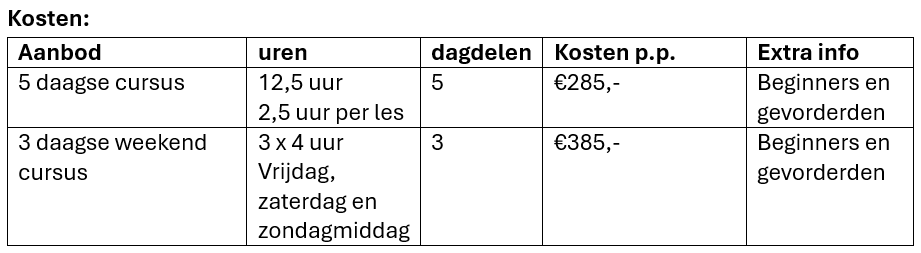 Tijdens de weekend (vr-zo) of 5-daagse cursus, zitten beginners en gevorderden door elkaar.